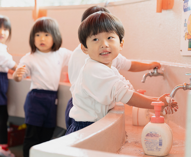 園は9時からですが、園バス、自家用車、徒歩、自転車などさまざまな方法で登園します。登園してきたこどもたちは興味関心のある遊びを自ら選び、クラスの友だちと一緒に意欲をもって取り組みさまざまな遊びを展開しています。