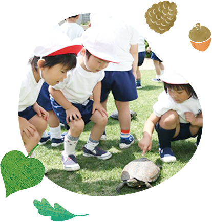 身近な自然を求めて、本園では保育の一環として園外(れんげ畑や草原、どんぐり山など)へ出かけ生き物の生活に直に触れる機会を多くもっています。その中からこどもたちの思いを受けとめ、クラスの仲間で互いに共感しあえるよう、保育者はこどもたちの小さな発言や表現を支えながら学びに導いています。これらの活動は主に午前中に行われます。
