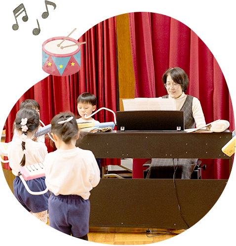 自由遊び後の「設定保育」では一人ひとりのこどもたちが、自ら考え、思い、自己をしっかり表現できるように、身近な自然やさまざまな題材を保育に取り入れ、表現やリズム遊び・絵本読み・歌・絵画造形などにこどもたちが主体となって取り組めるよう保育者は援助していきます。