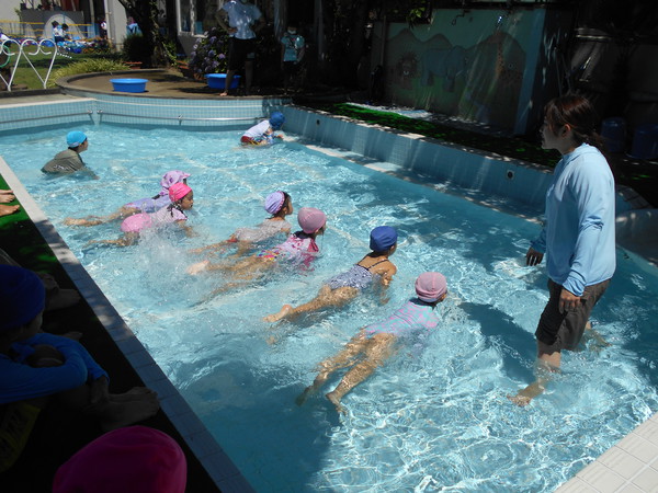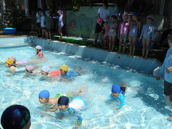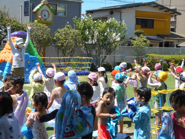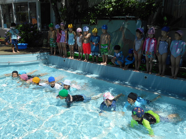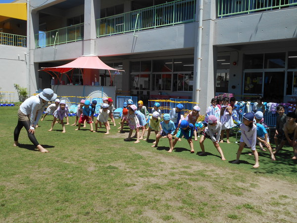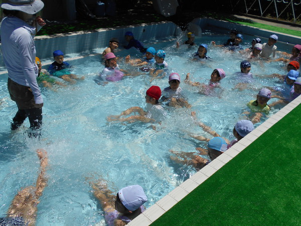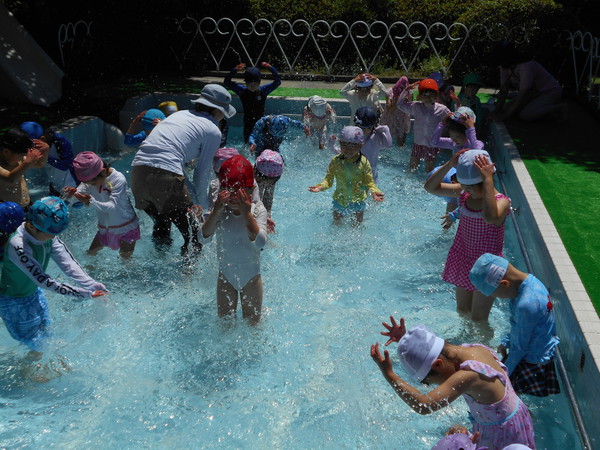 2022.06.29 プール遊び 年長組の子どもたちは梅雨明けの晴天の中、水しぶきを上げて大喜びでした。 お天気の日は、年中組も年少組もプール遊びをします。 園庭の芝生でスプリンクラーをまわして水遊びもします。