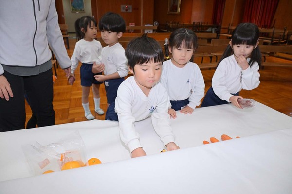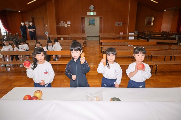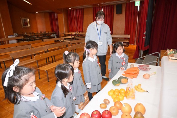 秋の恵みに感謝し、子どもたちが各ご家庭から持ち寄った果物やお野菜を祭壇にお捧げしました。
