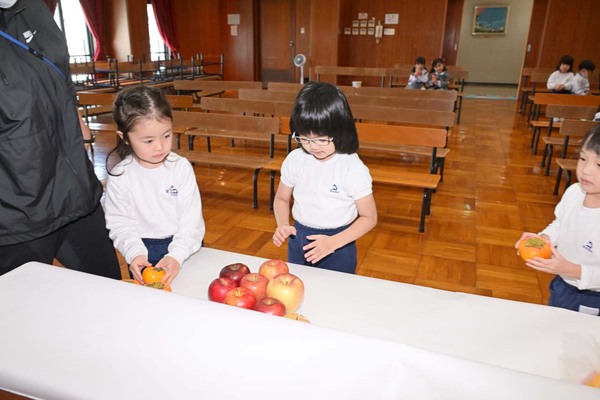 子どもたちから感謝の気持ちを添えてお野菜や果物をプレゼントしに行きました。